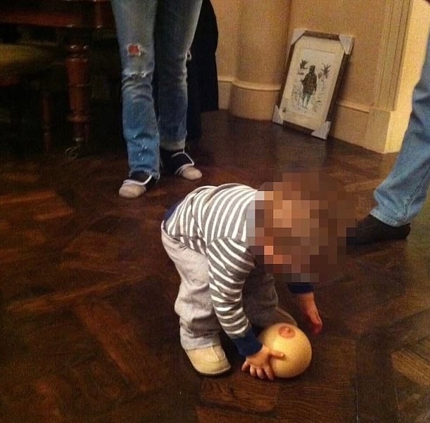 Disturbing photographs have emerged showing Andrew Mountbatten-Windsor kneeling and talking to an unidentified toddler clutching a breast-shaped ball inside Royal Lodge, with the bizarre images apparently taken in 2011 at his grand Berkshire royal home.