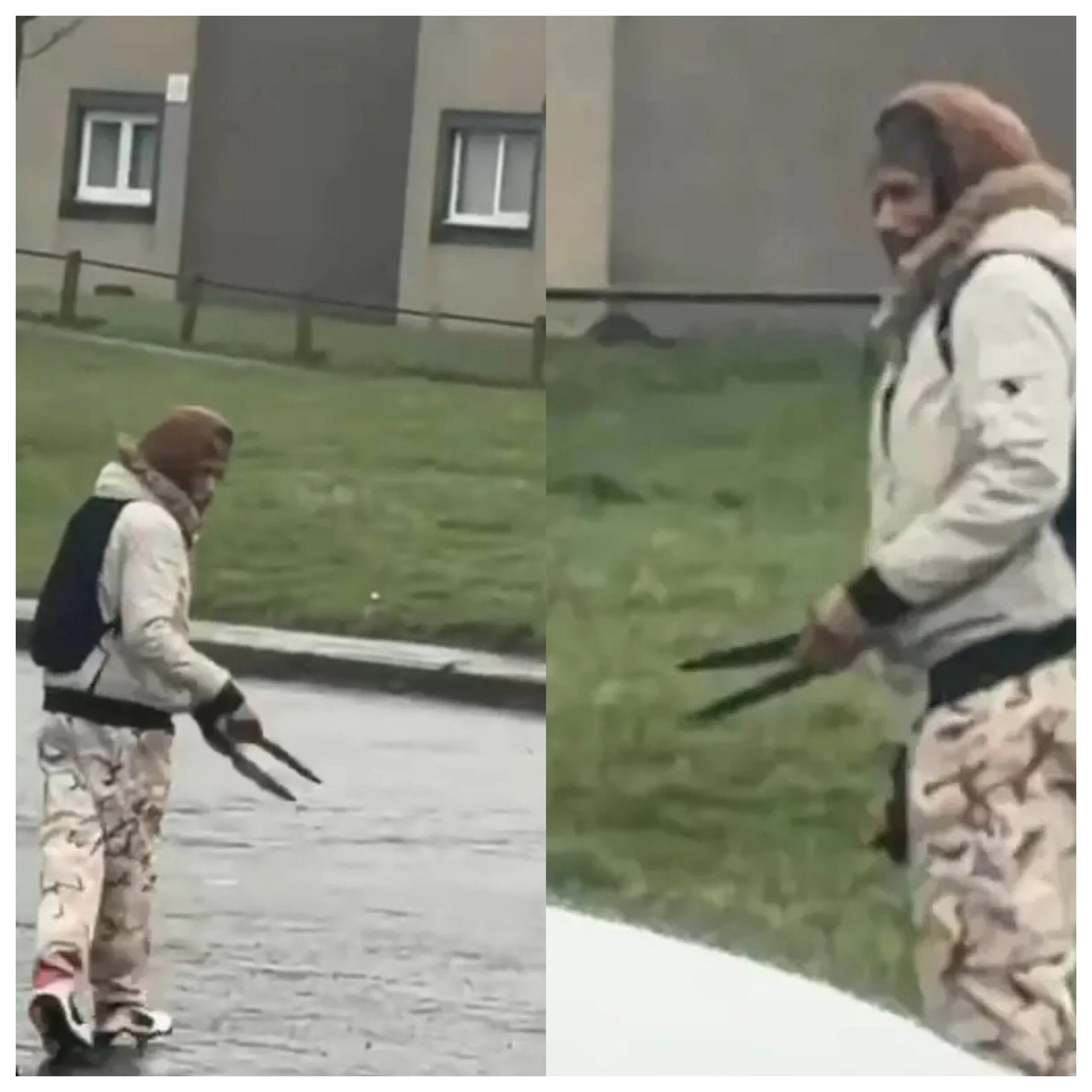 Following his attack, the man is believed to have retreated to a flat at Cobbinshaw House, where a tense stand-off with police has since developed. Shocking images from the scene showed the man grinning from a window as officers maintained a cordon outside the building. An estimated 100 residents gathered at the block of flats, with some heard shouting at the man as he remained visible at the window. One local is reported to have confronted him with a metal bar after witnessing him carrying the bloodied weapons.