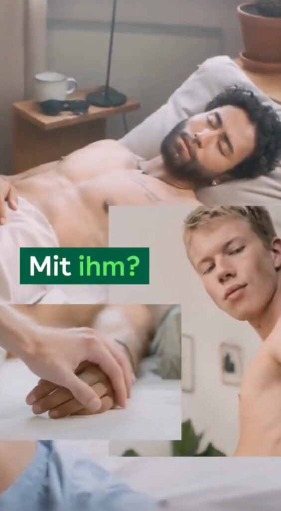 The advertisement, produced by AOK as part of its 2021 “#AllesOK” campaign, shows a young fair-skinned German couple in bed. While the woman briefly leaves the room, the man wakes to find a dark-haired, bearded man of Mediterranean appearance beside him. On-screen text reads “Mit ihm?” — “With him?” The woman returns, sees both men and smiles, as the text shifts to “Mit beiden?” — “With both?” — before the hashtag “#AllesOK” appears and the three are shown cuddling together. The voiceover states: “With AOK, your love life is safe. We pay for your contraception counselling.”