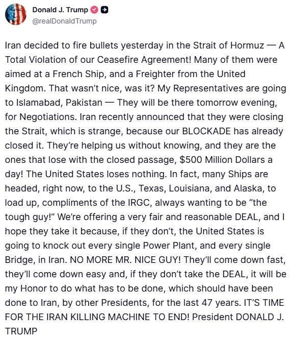 In a lengthy post on his Truth Social platform, the US president responded directly to Iran’s decision to close the Strait of Hormuz — a move that included what Trump described as gunfire directed at vessels in the waterway, among them a French ship and a British freight carrier. “Iran decided to fire bullets yesterday in the Strait of Hormuz — a total violation of our ceasefire agreement,” Trump wrote, adding: “That wasn’t nice, was it?”