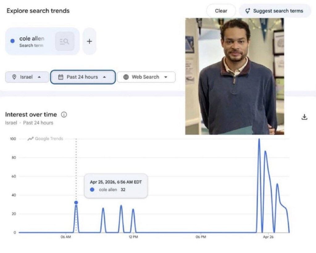 A separate and unverified claim has since added further momentum to those theories. Multiple posts on social media assert that Google Trends data shows a notable spike in searches for Allen’s name originating from Israel in the hours before the incident — with some accounts claiming the peak occurred as early as 6am, more than fourteen hours before the alleged shooting at approximately 8.34pm Eastern Time. Screenshots of the purported data have been shared extensively across platforms.